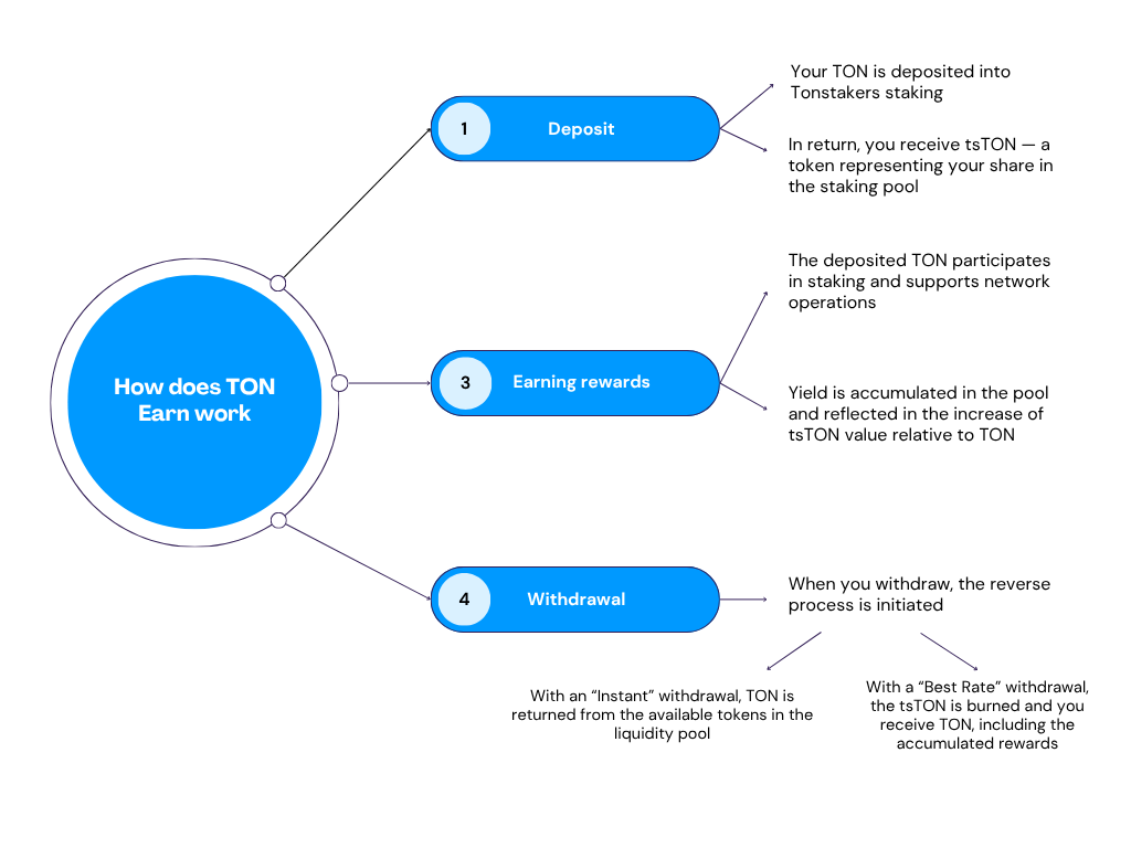 TON Earn is a DeFi-protocol by Tonstakers, available directly in the TON Wallet interface. It allows you to: