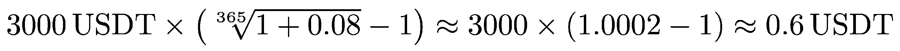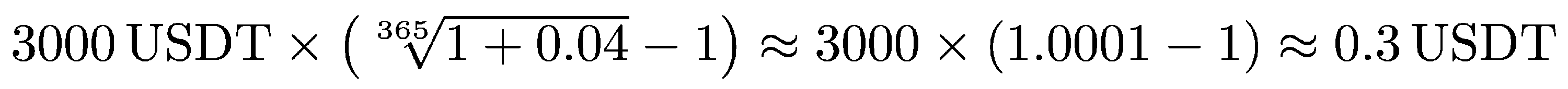 Let us look at the example above, assuming a rate of 4% APY. The reward for April 13 will be calculated based on a balance of 0 USDT, as the minimum balance on April 12 was 0 USDT. The reward for April 14 will be calculated based on the minimum balance on April 13, which is 1500 USDT. In that case the reward would be around 0.15 USDT.