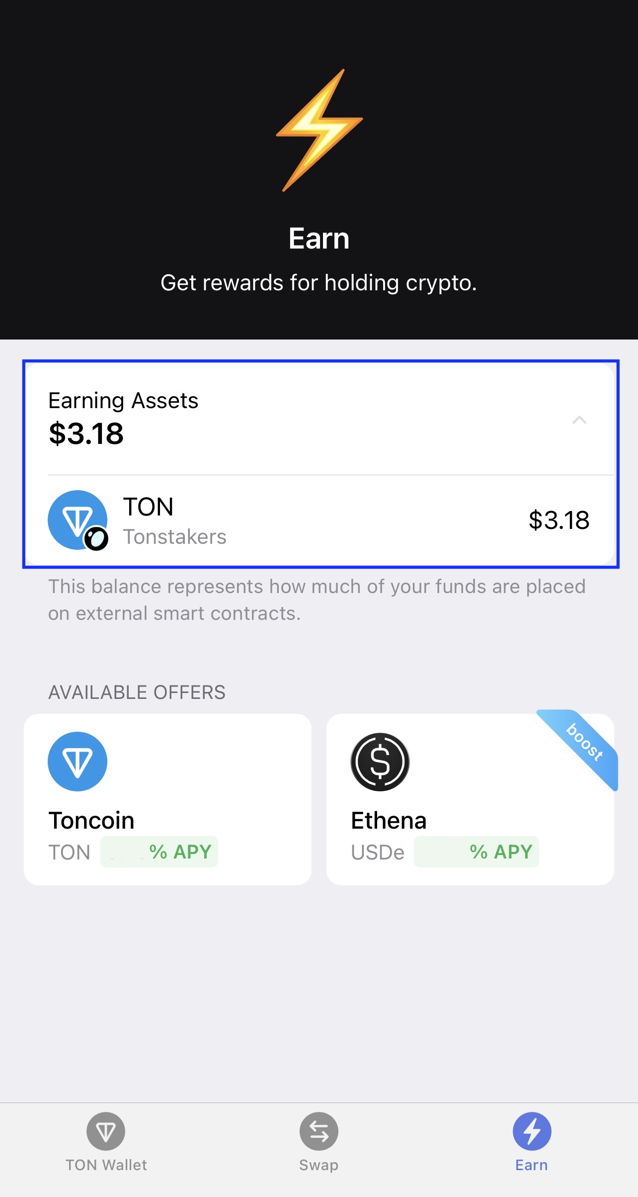 Important: Rewards not yet claimed in your TON Wallet do not appear in the “Earning Assets” section.