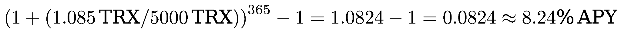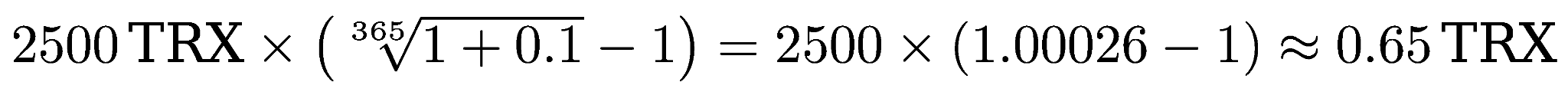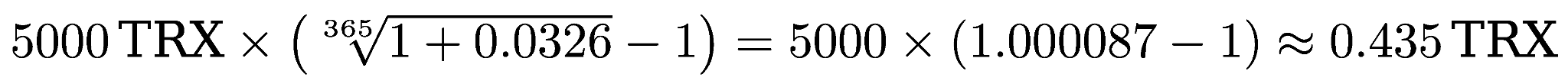 Let us look at the example above, accounting for 3.26% APY. The reward for March 7 will be calculated based on a balance of 0 TRX, as the minimum balance on March 6 was 0 TRX. The reward for March 8 will be calculated based on the minimum balance on March 7, which is 1000 TRX. In that case the reward would be around 0.0878 TRX.
