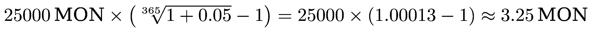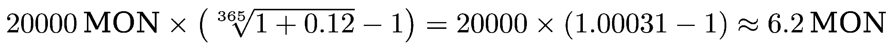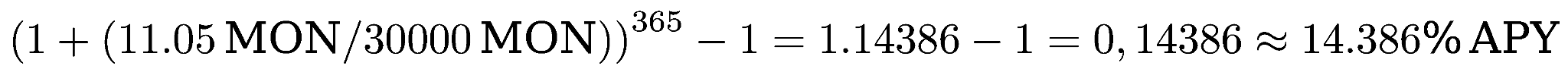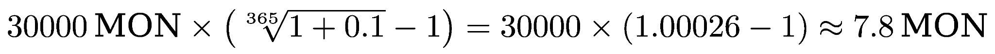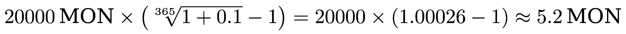 Let us look at the example above, accounting for 10% APY. The reward for January 18 will be calculated based on a balance of 0 MON, as the minimum balance on January 17 was 0 MON. The reward for January 19 will be calculated based on the minimum balance on January 18, which is 20,000 MON. In that case, the reward would be around 5.2 MON.