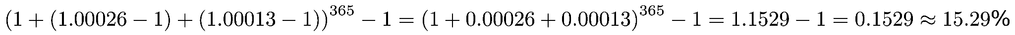 The final APY is 15.29%, not 15% (since the second reward payment goes to an already increased balance). Due to compounding, the final result is always greater than the simple sum. As a result, in order for the final APY to be exactly 15%, rewards for the current day may accrue at an APY lower than 15%.