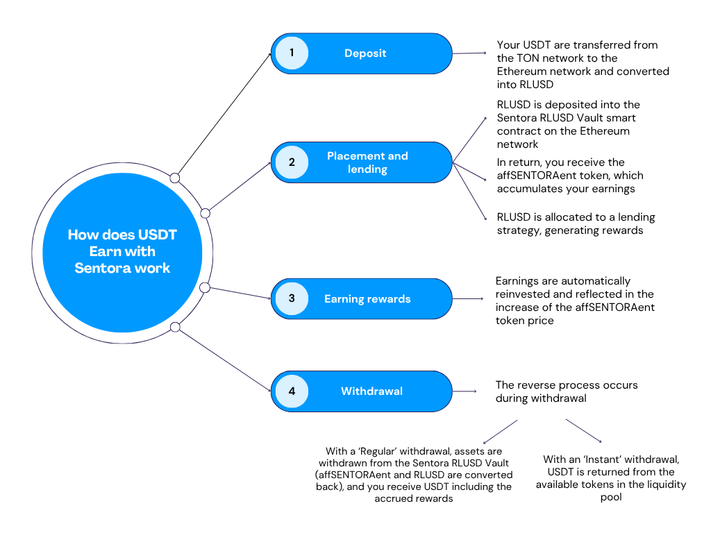 USDT Earn with Sentora is a DeFi-protocol by Sentora, available directly in the TON Wallet interface. It allows you to: